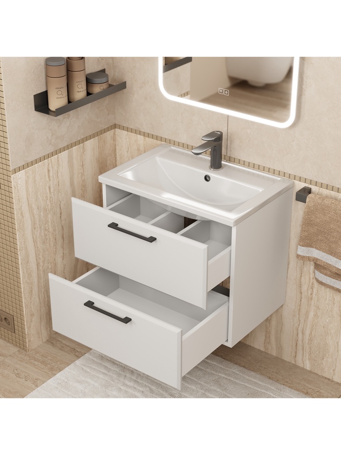 - Элегантный дизайн: тумба украшена приятной на ощупь матовой поверхностью Soft Touch, гармонично дополняющей интерьер ванной комнаты.
