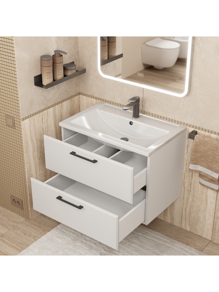Тумба с раковиной Uperwood Foster — надежное и практичное решение для ванной комнаты, выпущенное после полного обновления коллекции. Это готовое комплексное решение объединяет подвесную тумбу с двумя удобными ящиками и качественную раковину из литьевого мрамора. Специально разработанный дизайн с эргономичными ручками-скобами и оптимальной системой отверстий обеспечивает максимальную простоту и комфорт в использовании.