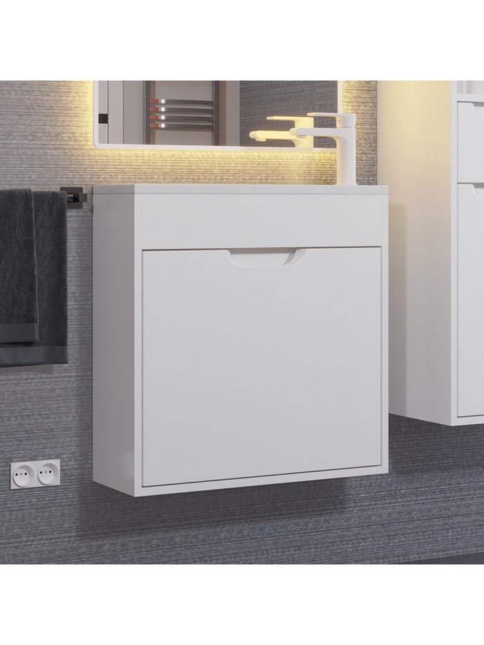 - Организация ванной комнаты: комплект помогает поддерживать порядок, скрывая средства гигиены за дверцей.