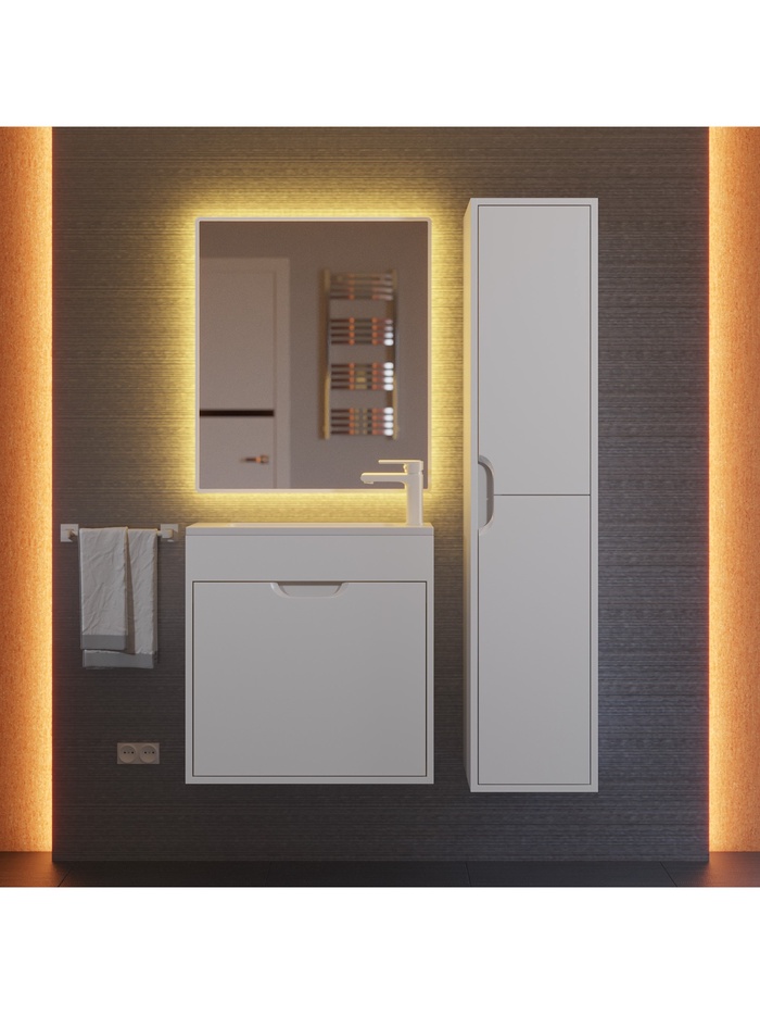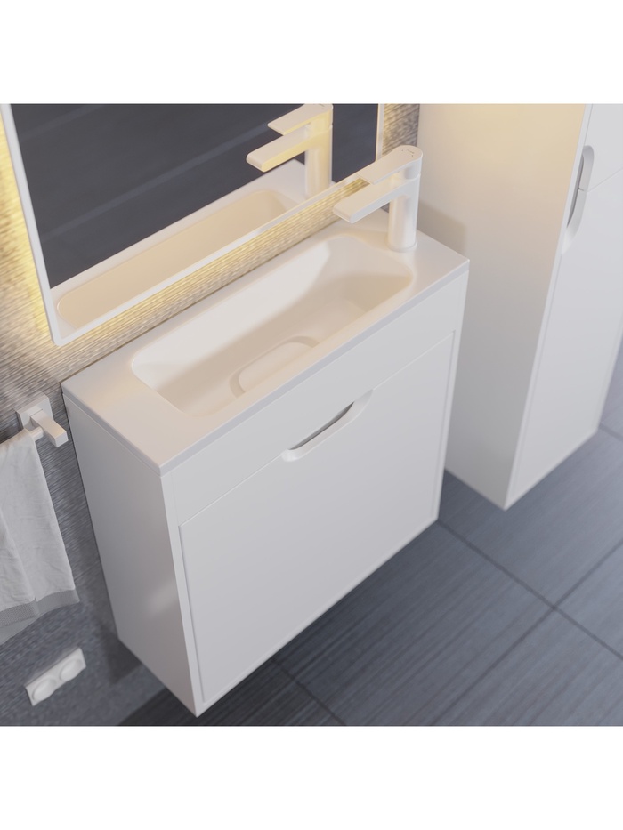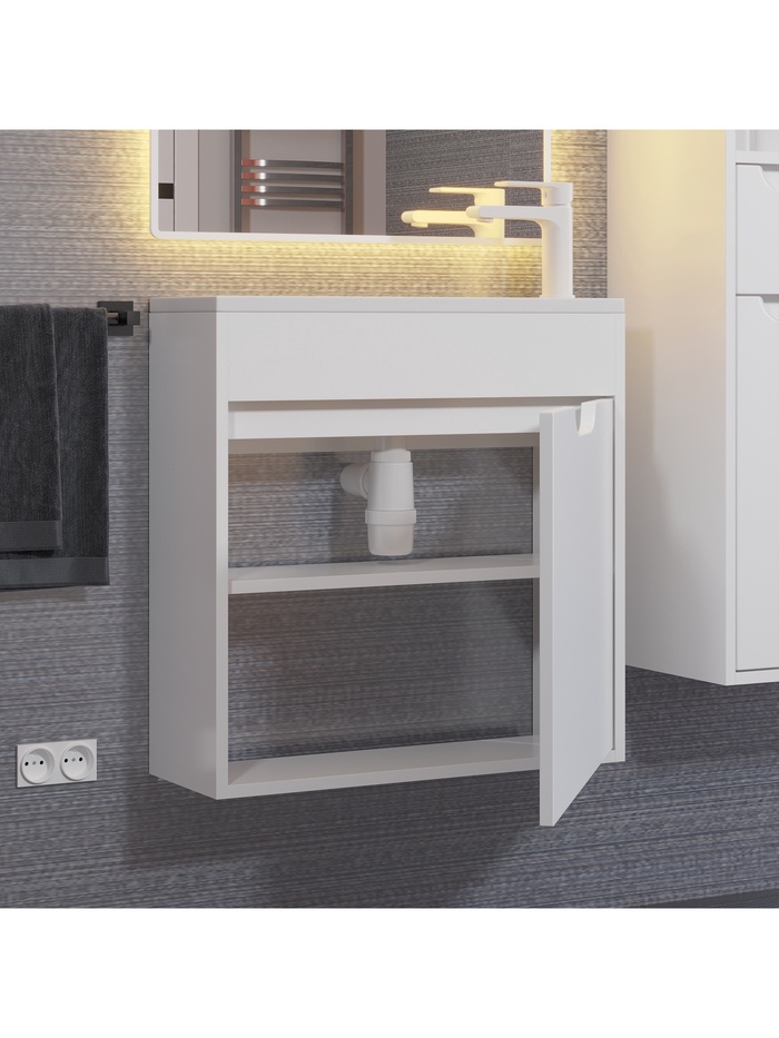 Готовое функциональное решение для ванной комнаты, объединяющее подвесную тумбу и раковину. Комплект выполнен в универсальном белом матовом цвете, который визуально расширяет пространство и создаёт ощущение чистоты и свежести. Подвесная конструкция создаёт эффект лёгкости, облегчает уборку и экономит полезное пространство. Тумба оснащена правой дверцей с доводчиком, обеспечивающим плавное и бесшумное закрывание, а внутреннее пространство позволяет удобно организовать хранение косметики и средств гигиены. Раковина из литьевого мрамора прямоугольной формы отличается прочностью, долговечностью и элегантным внешним видом.