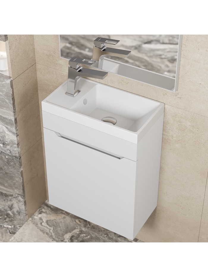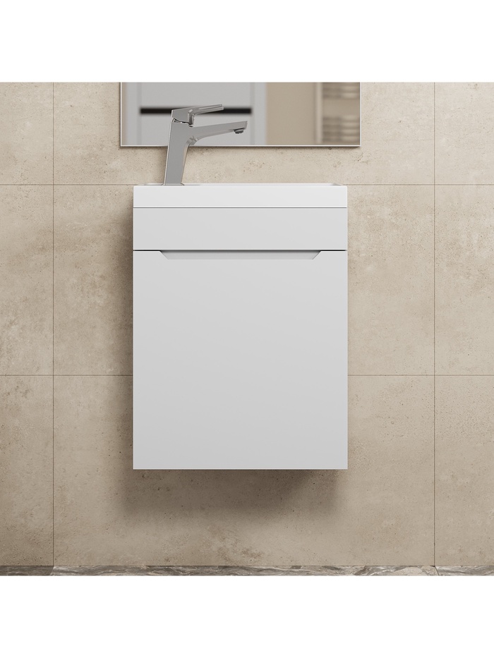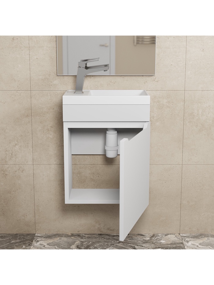 Компактное готовое решение для ванной комнаты, объединяющее подвесную тумбу и раковину. Комплект выполнен в универсальном белом матовом цвете, который визуально расширяет пространство и создаёт ощущение чистоты и свежести. Подвесная конструкция создаёт эффект лёгкости, облегчает уборку и экономит полезное пространство. Тумба оснащена правой дверцей с доводчиком, обеспечивающим плавное и бесшумное закрывание, а внутреннее пространство позволяет удобно организовать хранение косметики и средств гигиены. Раковина из литьевого мрамора прямоугольной формы отличается прочностью, долговечностью и элегантным внешним видом.