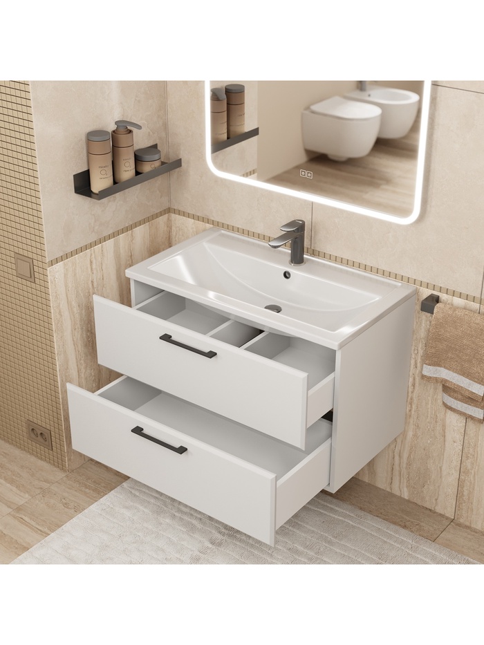 - Монтаж: подвесная тумба поставляется в собранном виде и укомплектована всей необходимой фурнитурой для быстрой установки.