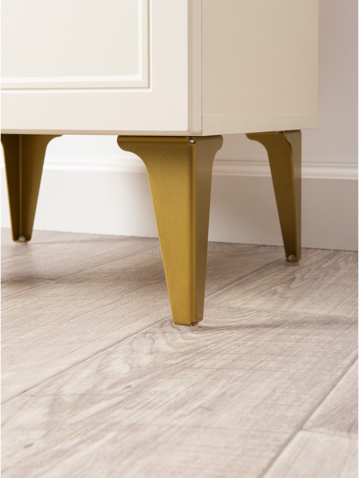 Металлические ручки и опоры золотого цвета добавляют изысканный акцент, а фурнитура с доводчиками обеспечивает плавное и бесшумное открывание и закрывание.