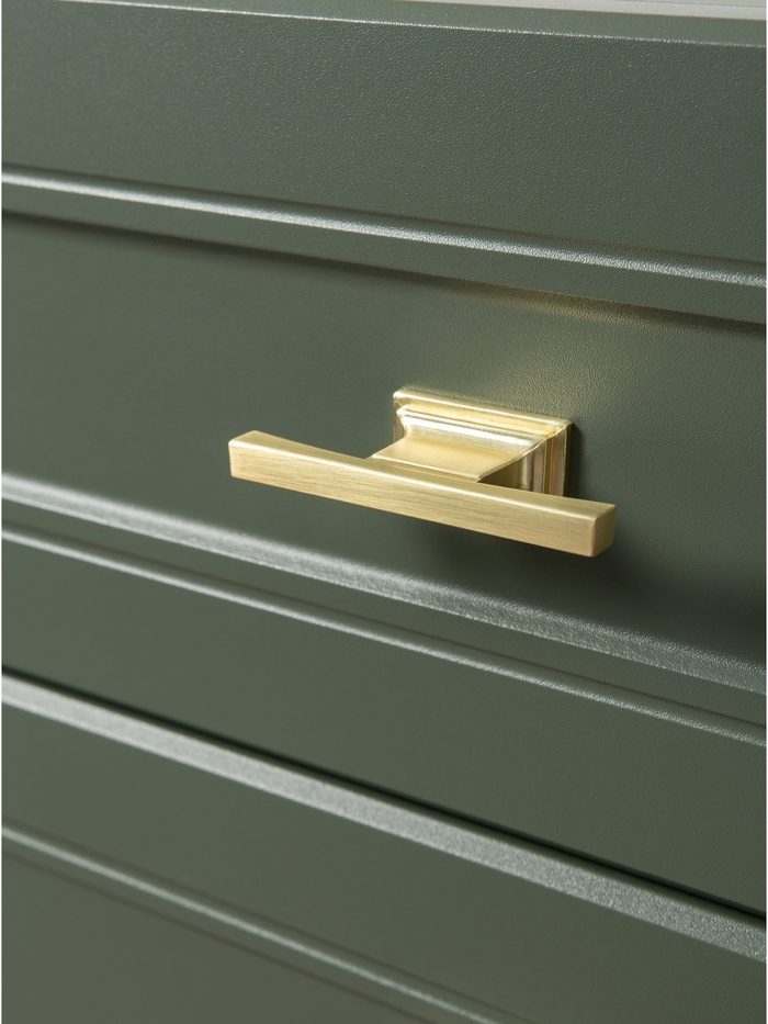 Фасады с глубокой фрезеровкой из МДФ подчёркивают классический стиль, а сочетание оттенков «Дымчатый зелёный» и «Олива шагрень» создаёт выразительный и благородный образ. Светлые элементы корпуса добавляют лёгкости и визуального баланса конструкции.