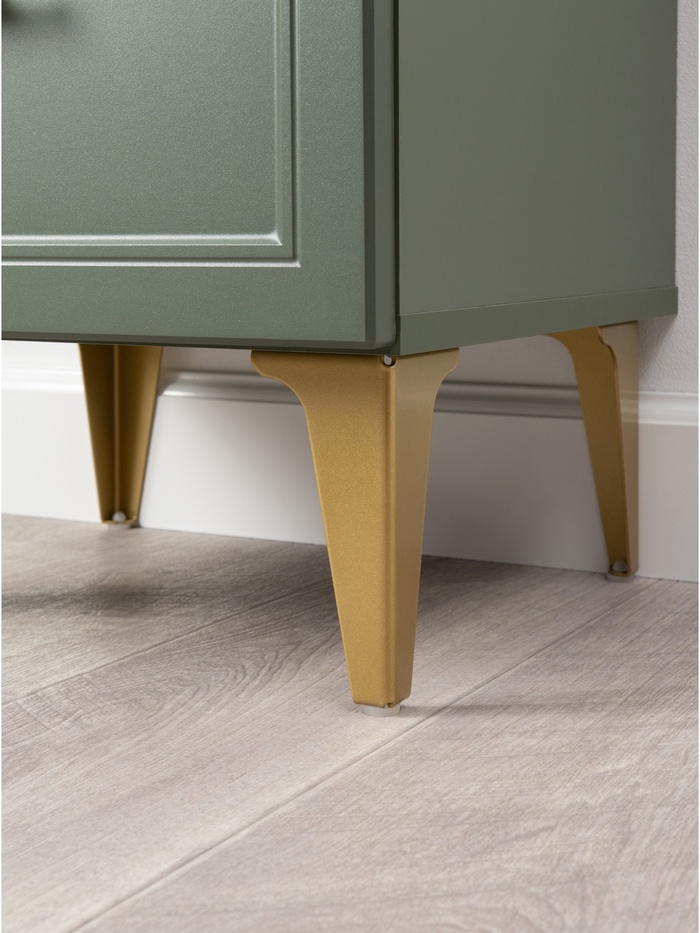 Металлические ручки и опоры золотого цвета придают мебели утончённый акцент, а качественная фурнитура с доводчиками обеспечивает плавное и бесшумное открывание и закрывание.