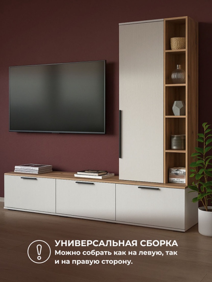 Элемент современной гостиной, сочетающий функциональность и лаконичный дизайн. Модель предназначена для организации ТВ–зоны с удобным хранением техники и сопутствующих предметов.