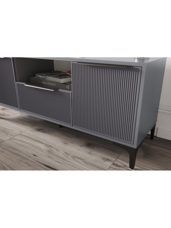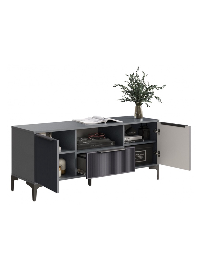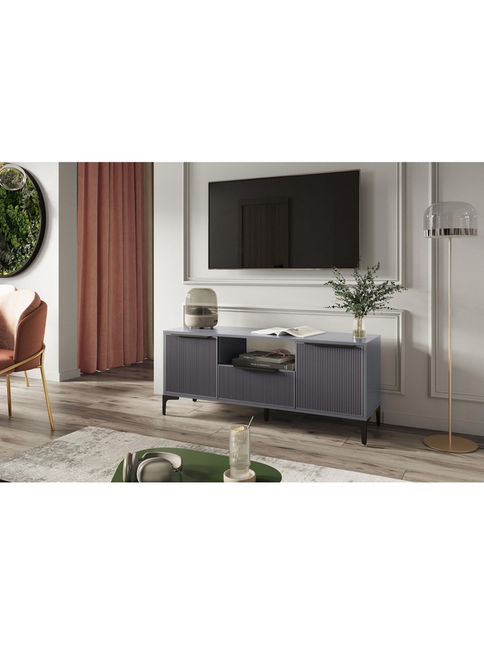 Сочетает рифлёные фасады из МДФ с прочным корпусом из ЛДСП 16 мм. Модель предназначена для размещения телевизора и аксессуаров, обеспечивая удобство использования и функциональное хранение.