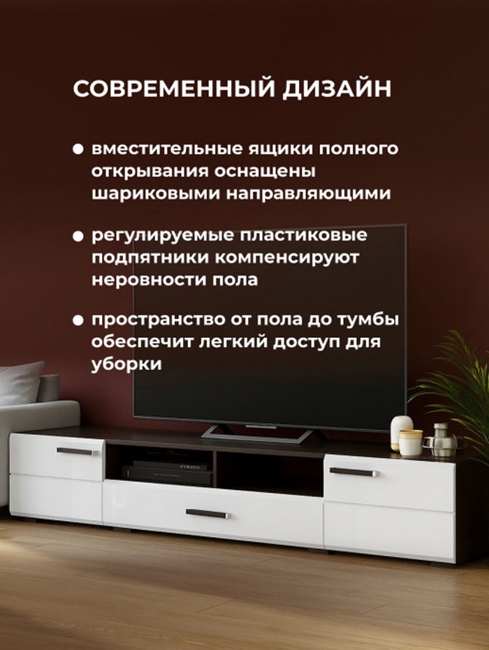 Тумба под ТВ «Иоги 2.0», 2000×460×350 мм, цвет венге/белый глянцевый – сочетает практичность и удобство в использовании. Подходит для повседневного использования и легко вписывается в интерьер дома или офиса.
