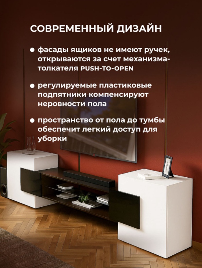 - Корпус из ЛДСП 16 мм: прочная и устойчивая основа для размещения телевизора и техники.