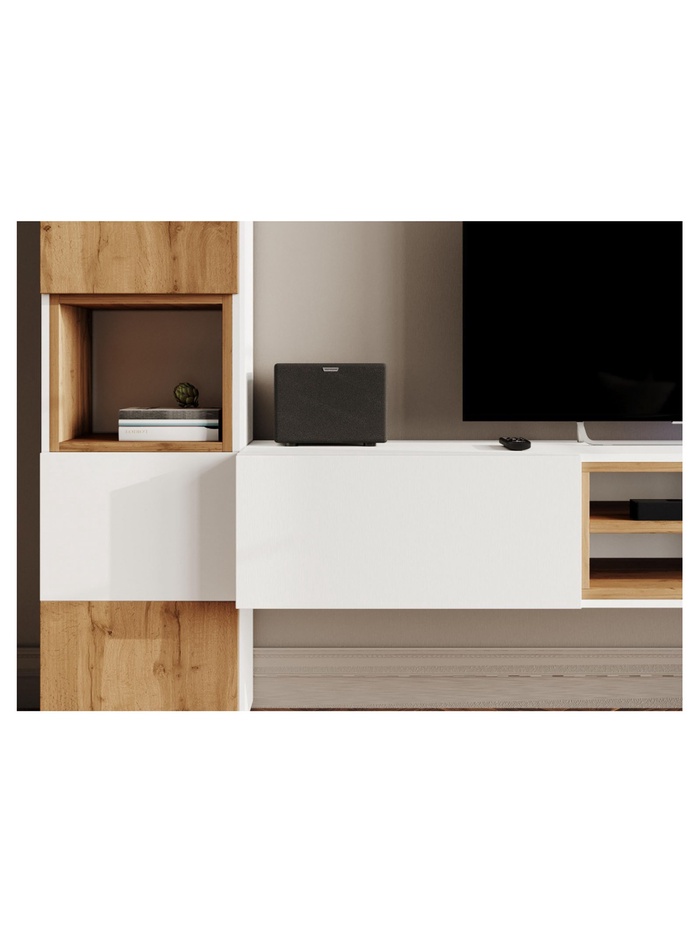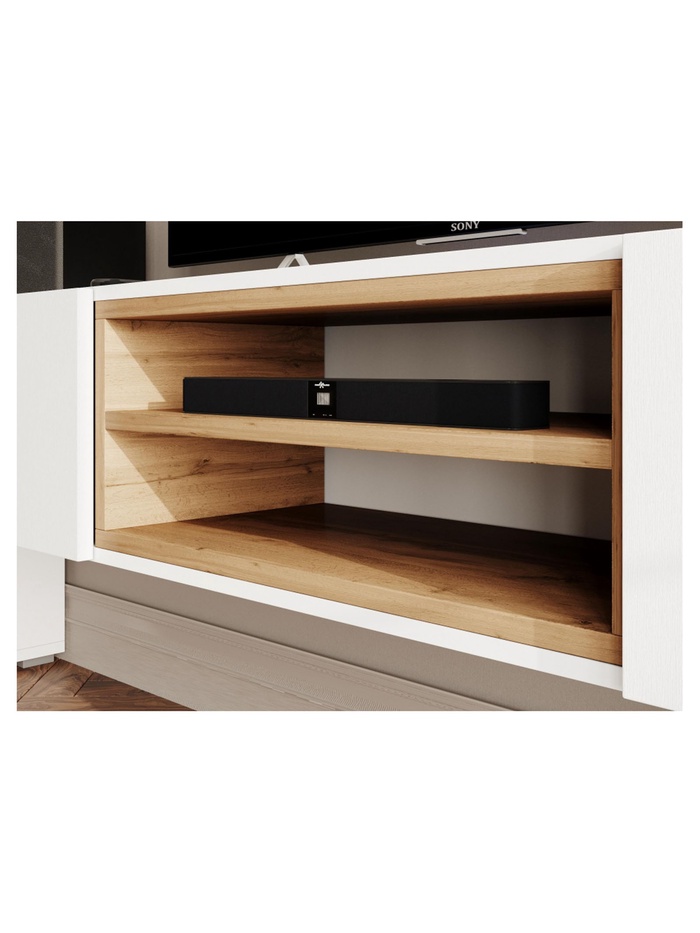 - Открытая полка: подходит для размещения приставки, ресивера или другой мультимедийной техники с быстрым доступом.