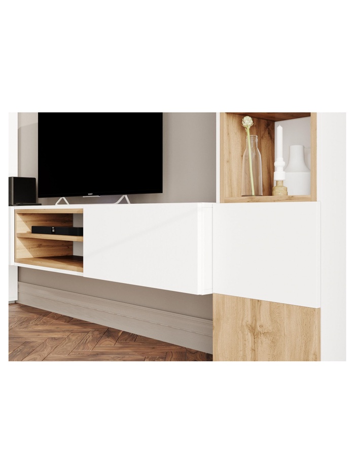 Предназначена для размещения телевизора и сопутствующей техники. Лаконичная конструкция сочетает закрытое и открытое хранение, что позволяет удобно организовать пространство в зоне гостиной.