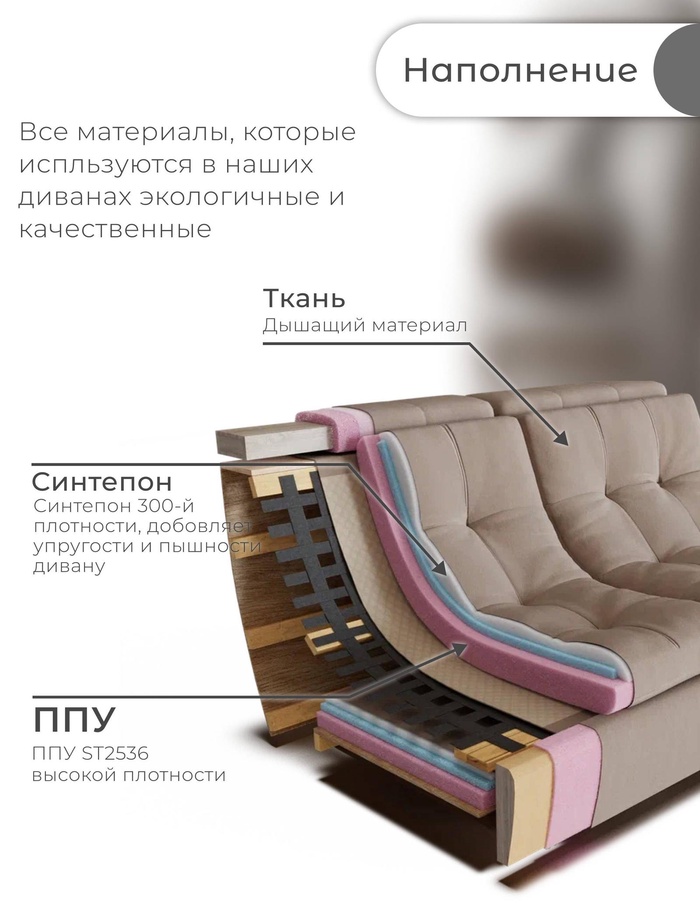 | Материалы из которых произведен товар | Дерево, синтепон, ЛДСП, пенополиуретан, мебельная ткань |