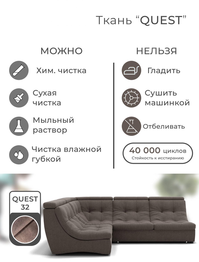 Технические характеристики Диван угловой модульный «Монако 3», ППУ, механизм венеция, велюр, цвет квест 032