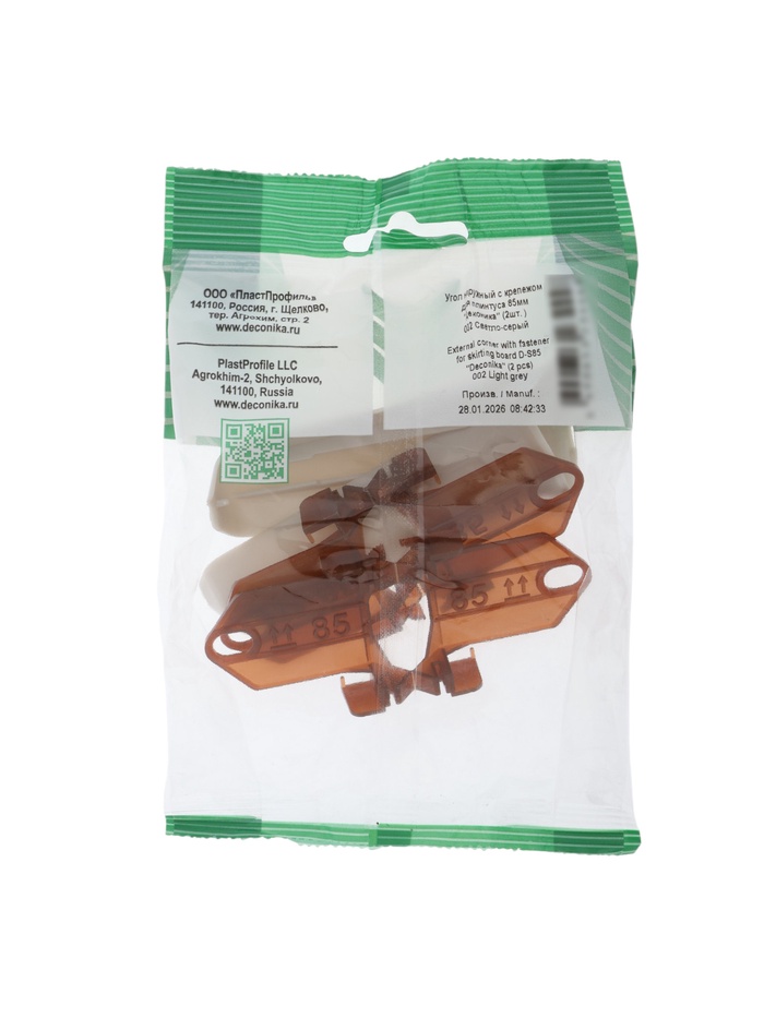 Технические характеристики Угол наружный с крепежом для плинтуса 85мм "Деконика" (2шт. во флоупаке), 002 Светло-серый