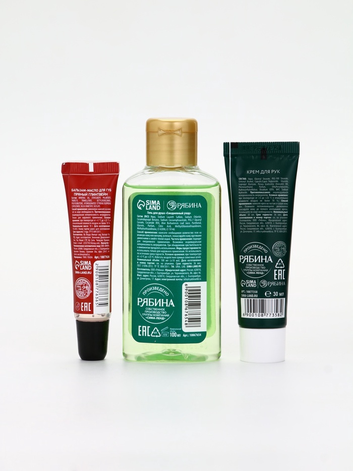 | Составляющие набора | Бальзам для губ; Гель для душа; Крем для рук |