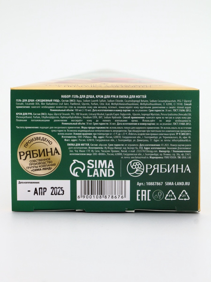 | Составляющие набора | Гель для душа; Крем для рук; Пилка |