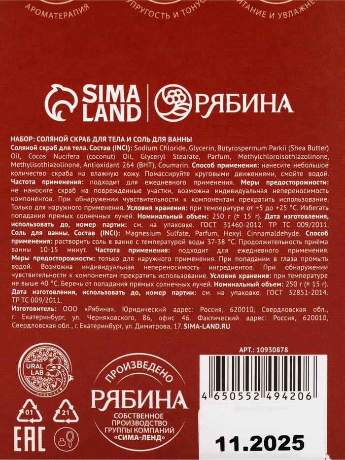 | Составляющие набора | Скраб; Соль для ванны |