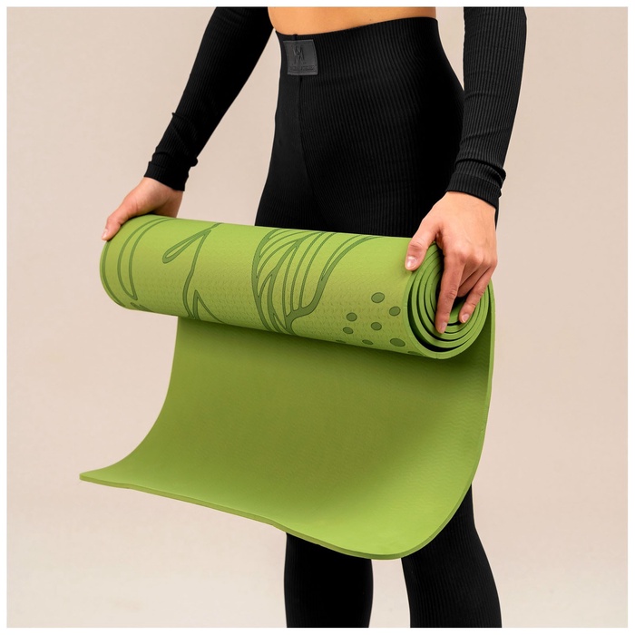 Коврик подходит для занятий йогой и фитнесом дома и в спортивных залах. Помогает в выполнении асан или других упражнений. Смягчает упор тела на твёрдую поверхность. Сохраняет форму после выполнения упражнений.