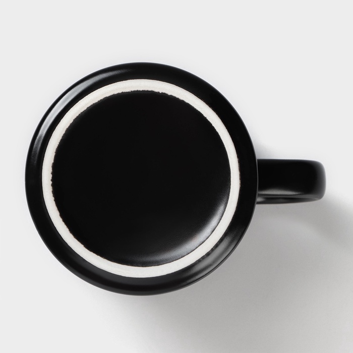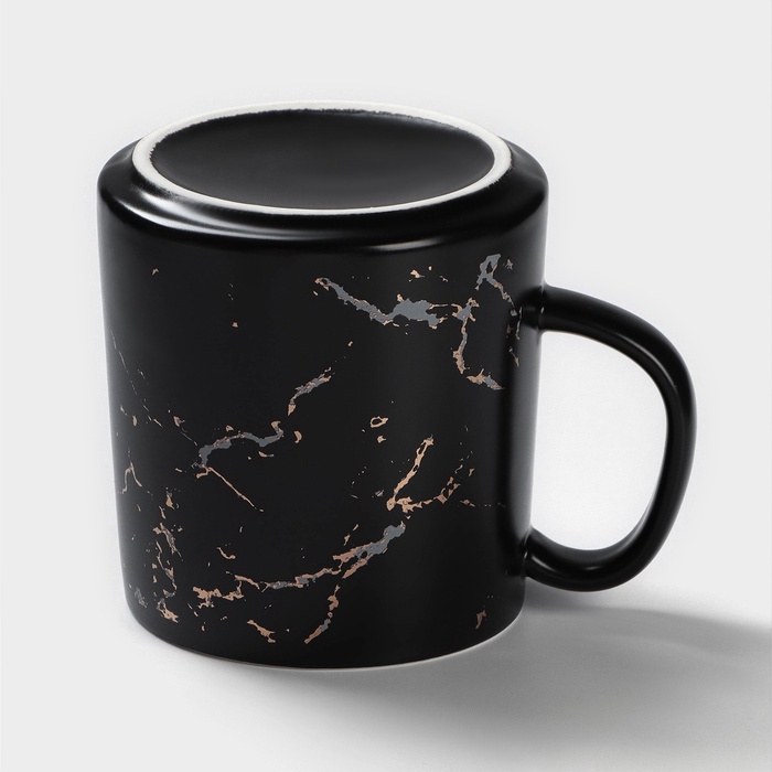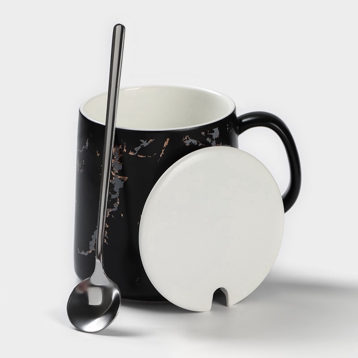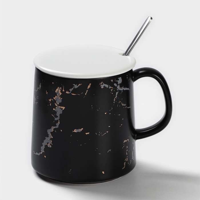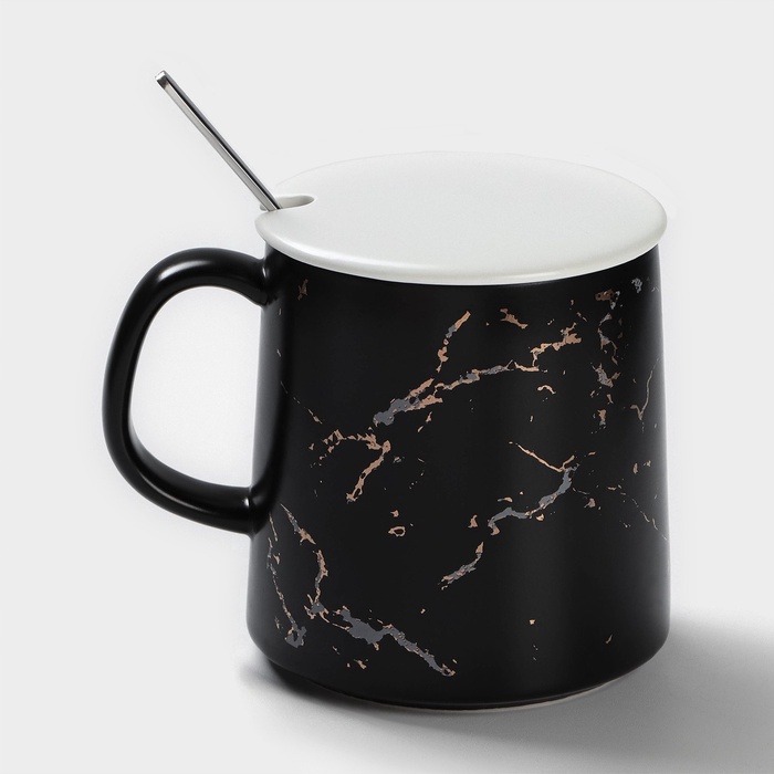 УЦЕНКА Кружка с ложкой «Чёрный мрамор», 350 мл, керамика, чёрная