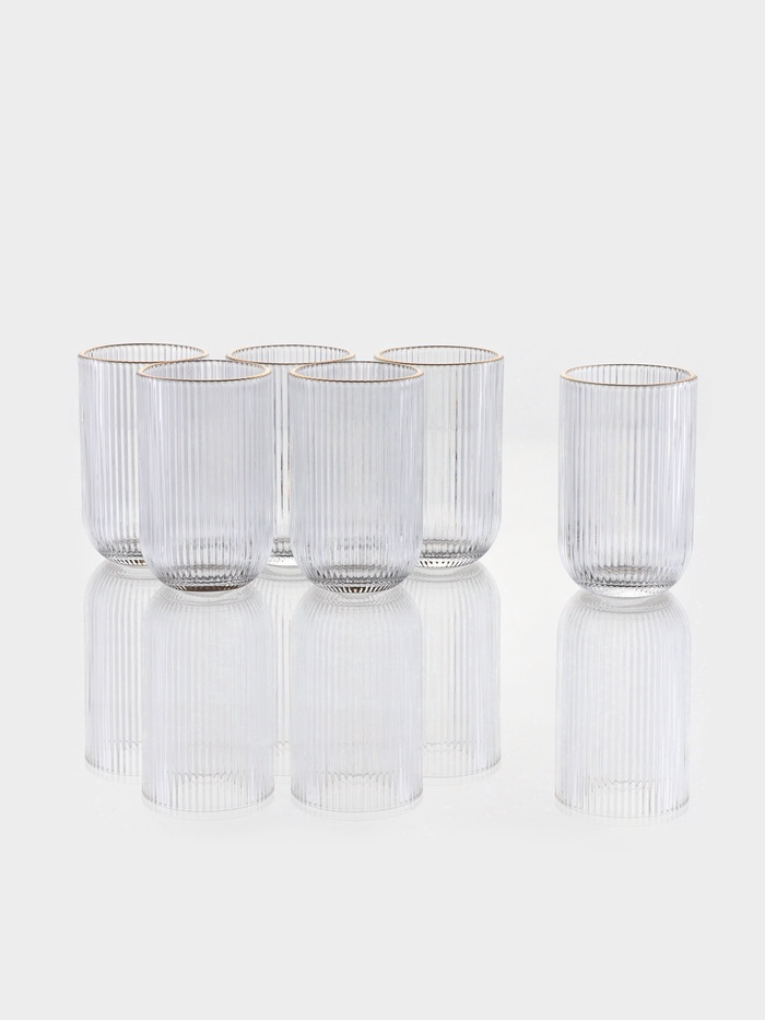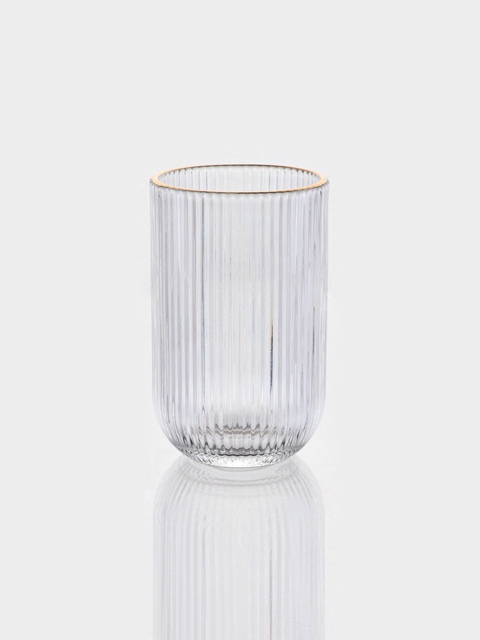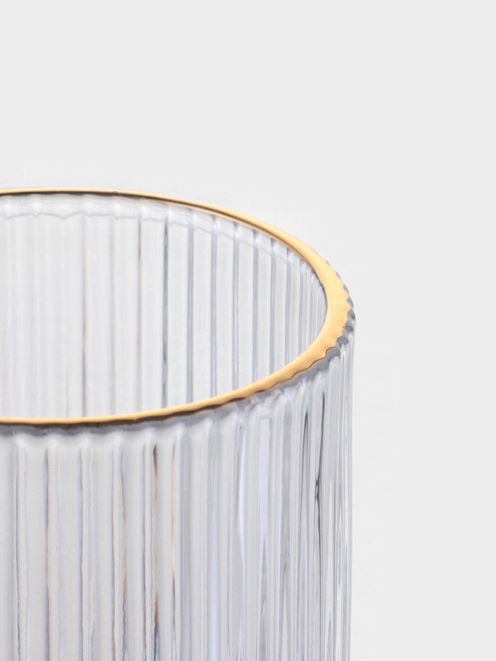 - Золотая отводка и рельеф: Лаконичный рисунок в виде вертикальных полос добавляет стаканам объёма и игры света. Позолоченная линия по краю — акцент, который подчеркивает изящество форм и сочетается с посудой в схожей стилистике.