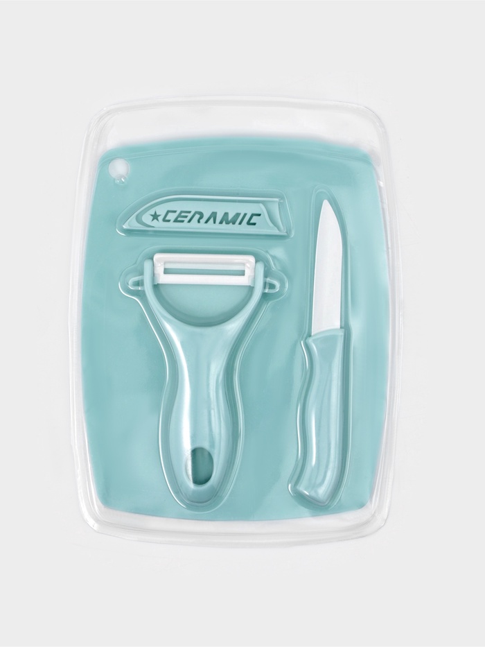 Технические характеристики УЦЕНКА Набор "Керамик" 3 предмета: нож 16 см, овощечистка 12 см, доска 19,5х15,5 см, цвет голубой 44