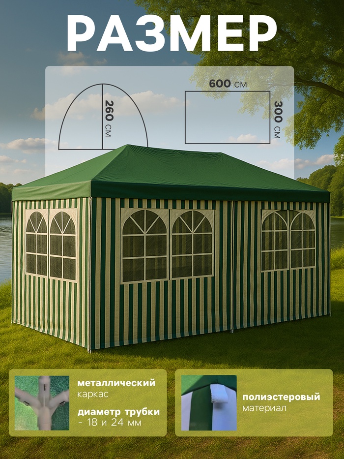 Просторный туристический шатёр размером 600×300 см с высотой 260 см – идеальное решение для комфортного отдыха на природе. Прочный металлический каркас с трубами диаметром 24 и 18 мм обеспечивает устойчивость, а тент из полиэстера плотностью 90 г/м² надёжно защищает от ветра и осадков. Закрытая конструкция с окнами и дополнительной стенкой создаёт уютное пространство, а зелёный цвет гармонично сочетается с природным окружением.