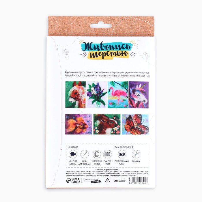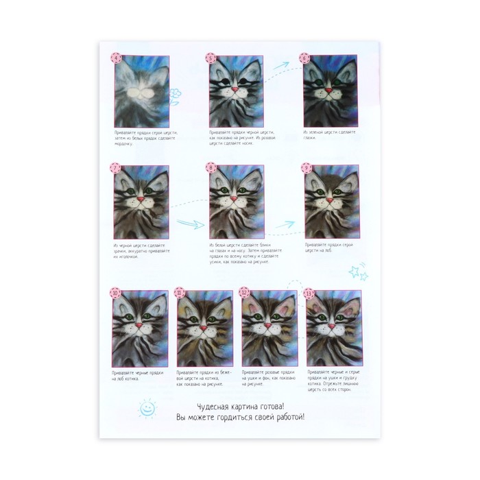 Данный вид творчества основан на валянии. Никогда не слышали о такой технике? Это не проблема: создать мягкое и пушистое панно вам помогут подробные инструкции и видео-мастер-класс, входящие в набор.