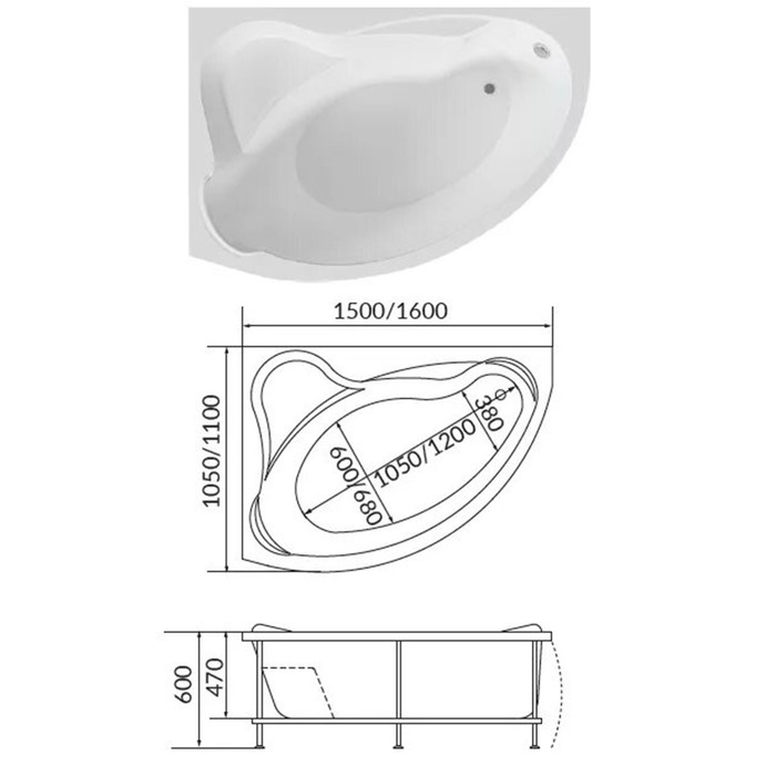 Технические характеристики Ванна акриловая 1MarKa CATANIA, 160х110 см, правая, без каркаса и панели