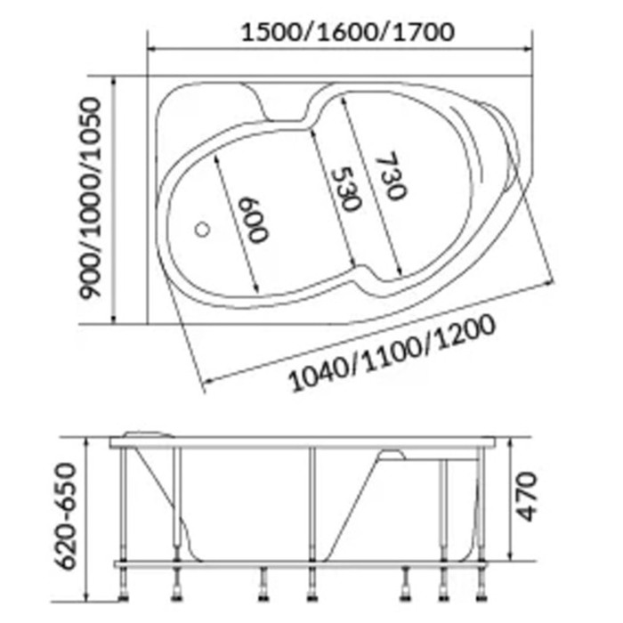 Технические характеристики Ванна акриловая 1MarKa DIANA, 150×90 см, правая, без каркаса и панели