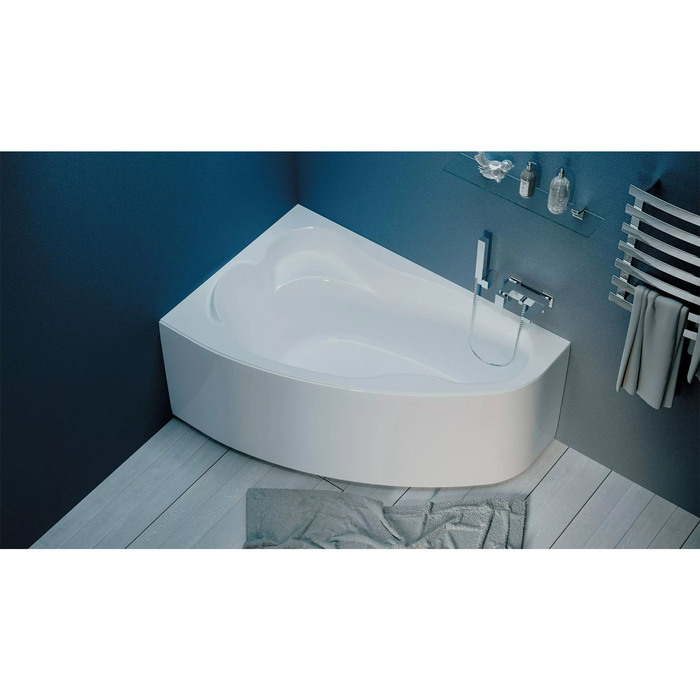 - Угловая форма 140×90 см: Занимает угол помещения, экономя пространство в центре. Размеры подходят для небольших ванных комнат.