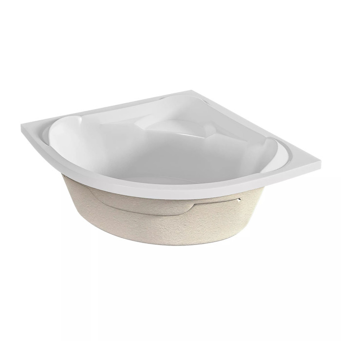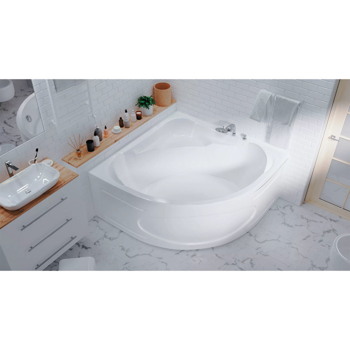 Угловая акриловая ванна 150×150 см, белая, толщина акрила 5 мм, высота 65 см, объём 350 л — просторная модель для установки в углу большой ванной комнаты. Изготовлена из акрила толщиной 5 мм. Форма симметричная угловая, подходит для размещения в любом углу помещения. Высота ванны 65 см, внутренний объём 350 л. Ванна поставляется без каркаса и декоративной панели — их необходимо приобрести отдельно.