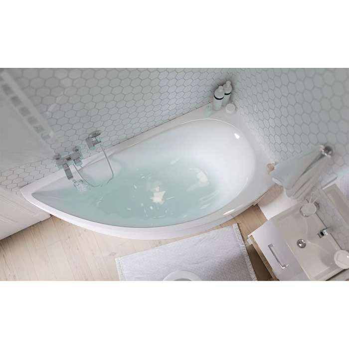 - Угловая форма 150×75 см: Занимает угол помещения, экономя пространство. Узкая конструкция подходит для компактных санузлов.