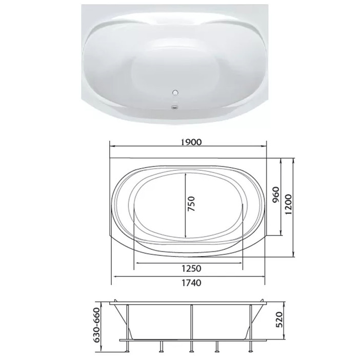Технические характеристики Ванна акриловая 1MarKa SIRAKUSA, 190×120 см, без каркаса и панели
