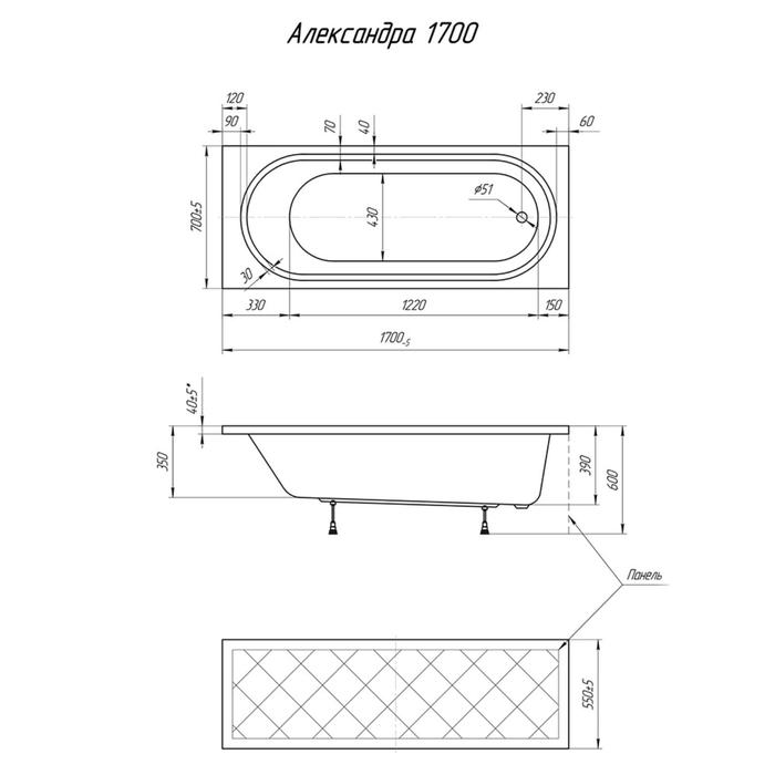 Технические характеристики Ванна акриловая Poseidon «Александра», 160×70 см, без каркаса и панели