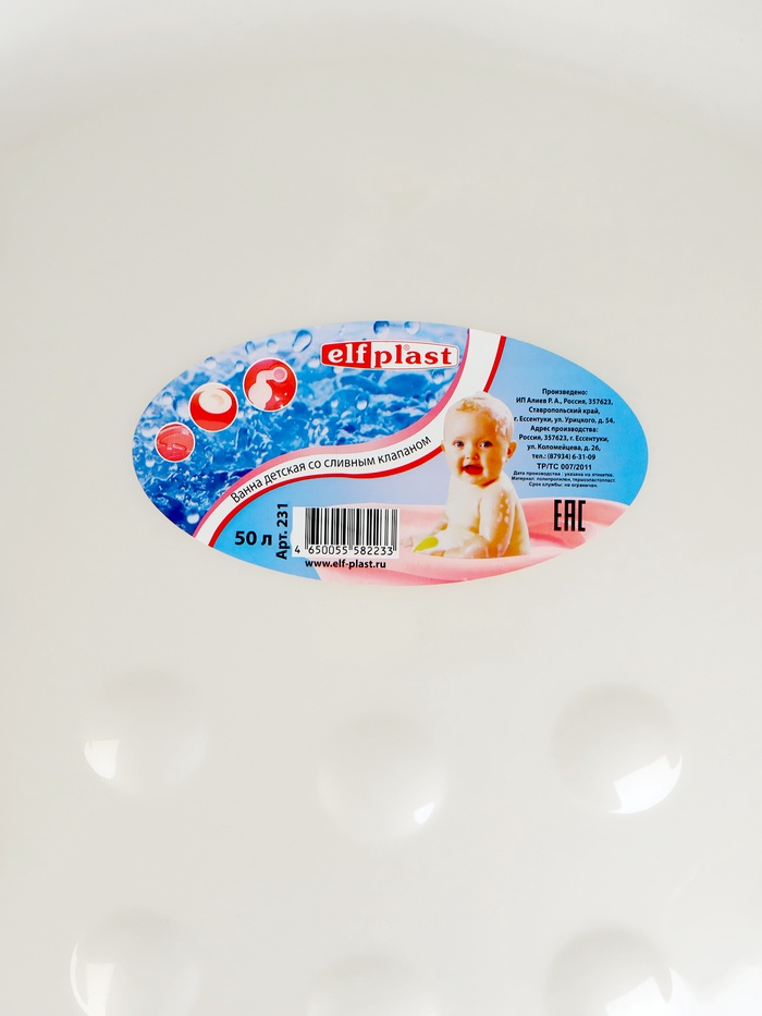 Технические характеристики Ванночка детская со сливным клапаном 50 л, цвет белый
