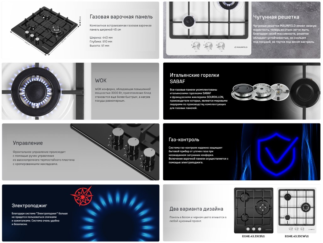 Технические характеристики Варочная панель MAUNFELD EGHE.43.33CB/G, газовая, 3 конфорки, чёрный
