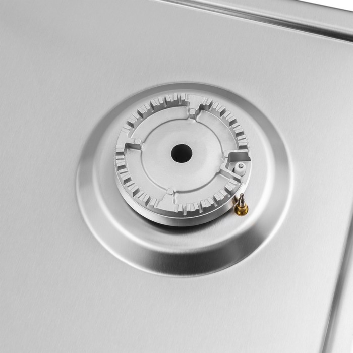 Газовая варочная поверхность органично сочетается с техникой и кухонной фурнитурой в металлических оттенках. Серебристый цвет воспринимается нейтрально и создаёт ощущение целостности интерьера, как естественная часть рабочей зоны.