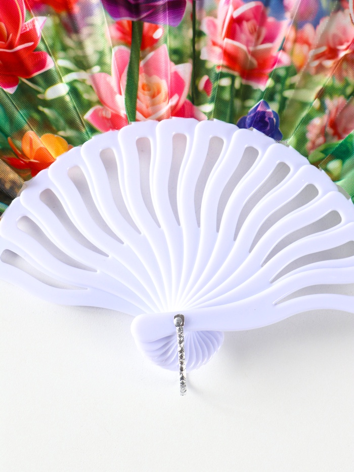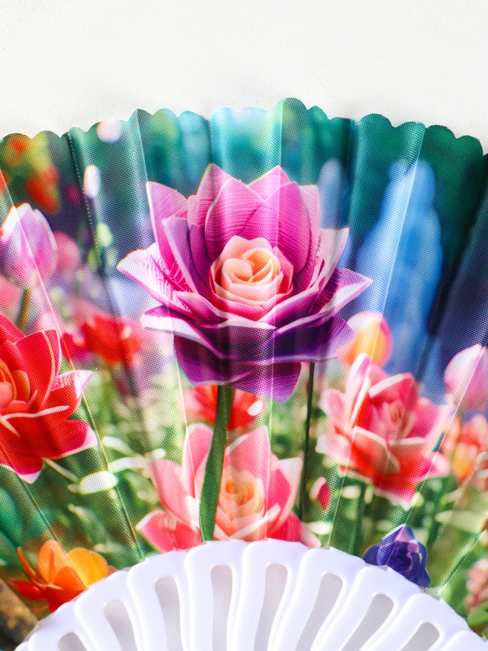 Этот складной веер с цветочным принтом создаёт приятную прохладу в жаркий день. Компактный размер делает его удобным спутником для прогулок, поездок или посещения мероприятий.