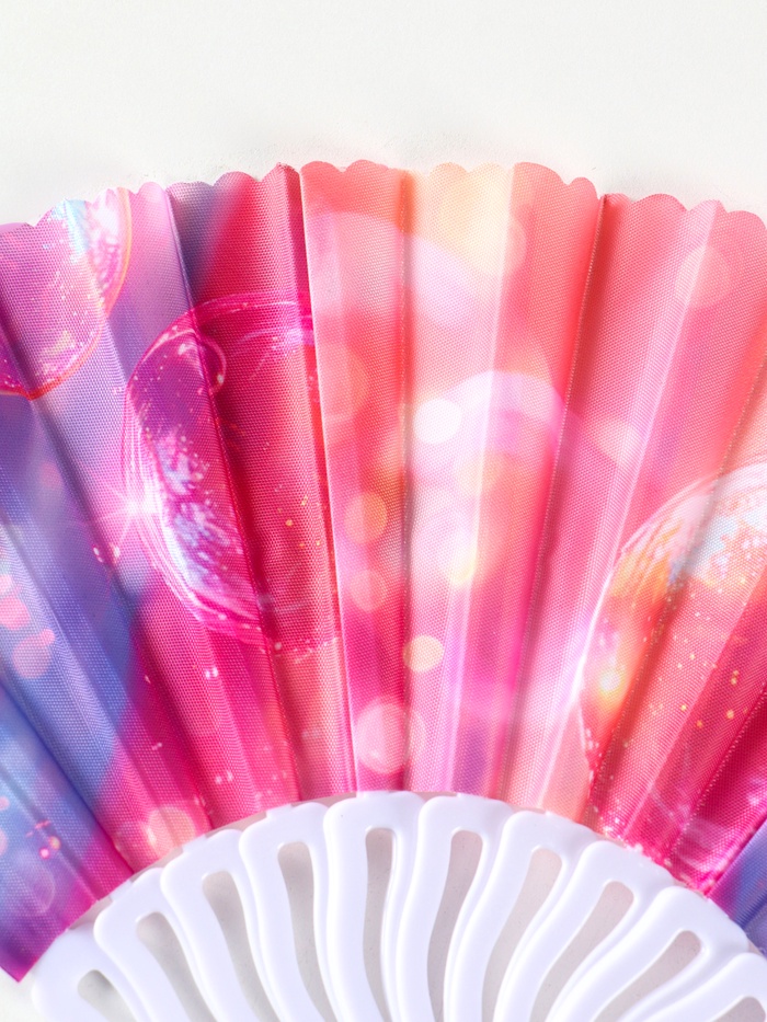 Этот складной веер с узором «Пузырьки» — ваш личный источник прохлады в жаркий день. Лёгкий и компактный, он легко помещается в сумку, готовый подарить вам приятную свежесть в городе, на пляже или на прогулке.