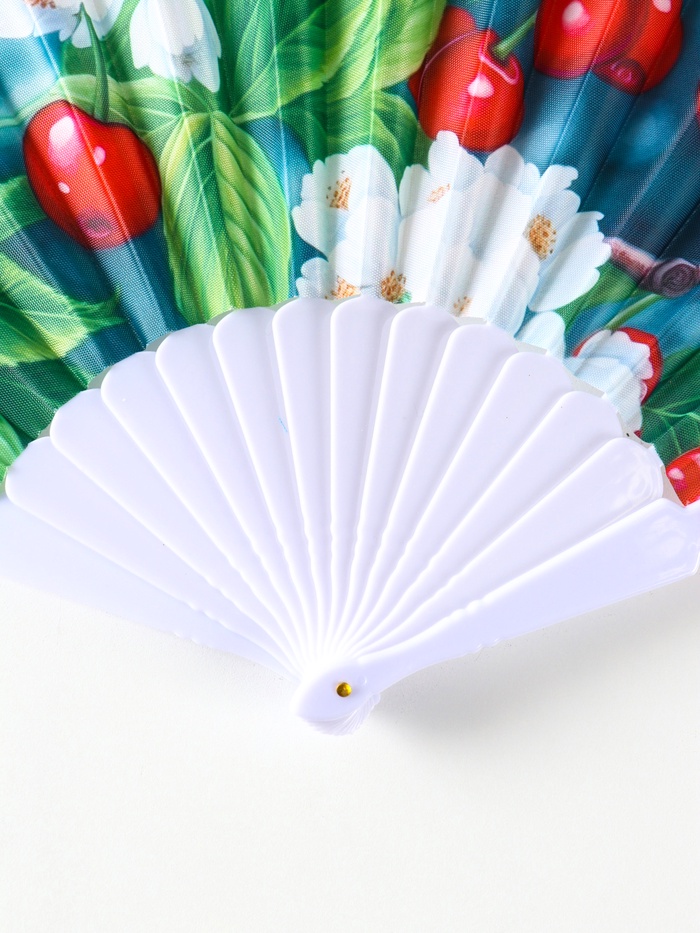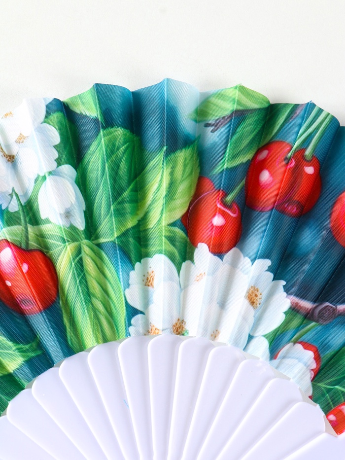 Этот складной веер с ягодным узором — лёгкий спутник для жарких дней. Он напоминает о прохладе летнего сада, когда ветерок колышет ветви цветущих деревьев.