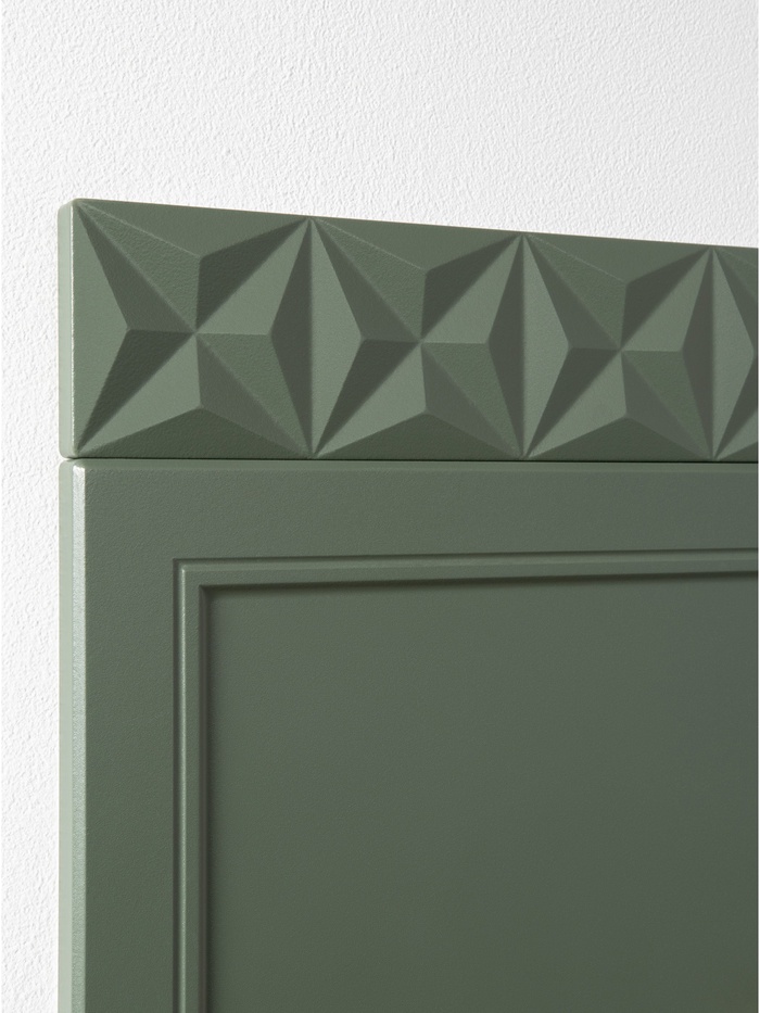 Модель выполнена в классическом стиле с декоративной фрезеровкой в верхней части, а благородный оттенок «Олива шагрень» с глубоким зелёным тоном создаёт уютную и гармоничную атмосферу.