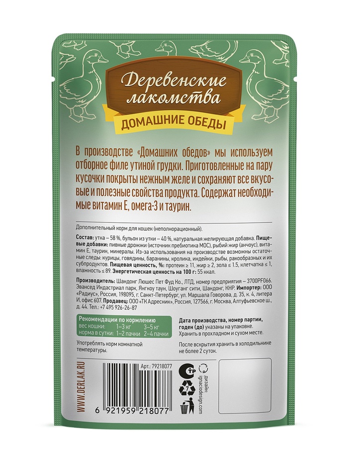 Консервированный влажный корм для кошек серии «Деревенские лакомства — Домашние обеды» — деликатес, созданный на основе отборного утиного филе, приготовленного на пару. Ваш пушистый гурман по достоинству оценит это высокое кулинарное искусство.