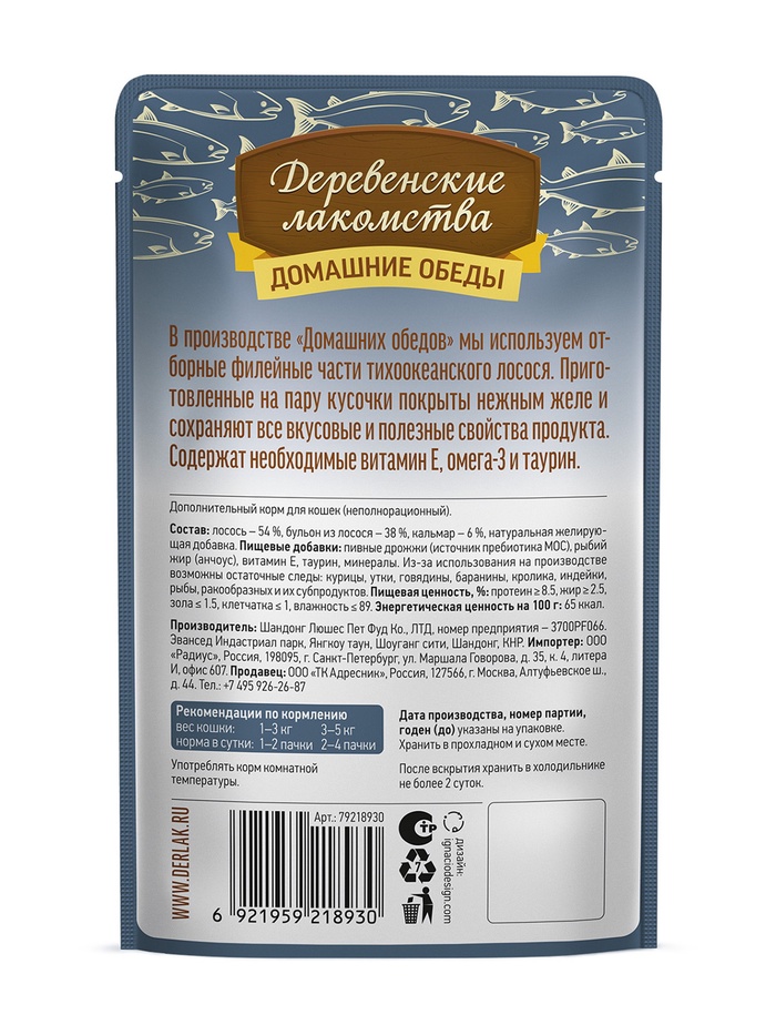 Консервированный влажный корм для кошек серии «Деревенские лакомства — Домашние обеды» — искусно приготовленные на пару ломтики лосося в дуэте с кальмаром. Изысканное лакомство, которое порадует абсолютно всех четвероногих гурманов. Легкая текстура желе облегчает процесс потребления, делая этот продукт идеальным даже для самых привередливых питомцев. Ваши забота и внимание обязательно будут оценены!