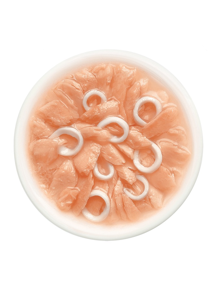 Состав: лосось — 54%, бульон из лосося — 38%, кальмар — 6%, натуральная желирующая добавка, пивные дрожжи (источник пребиотика МОС), рыбий жир (анчоус), витамин Е, таурин, минералы