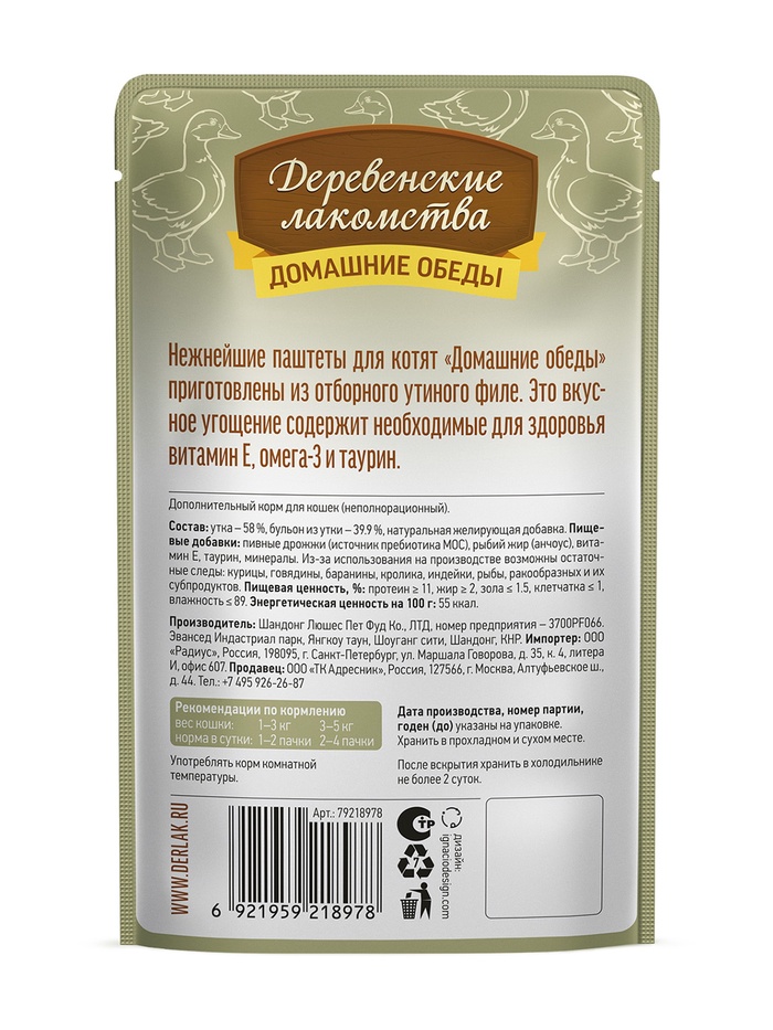Консервированный влажный корм для котят серии «Деревенские лакомства — Домашние обеды» в виде паштета из отборного утиного филе приготовлен специально для малышей по уникальной рецептуре и имеет нежную текстуру. Это вкусное угощение содержит витамин Е, Омега-3 и таурин.
