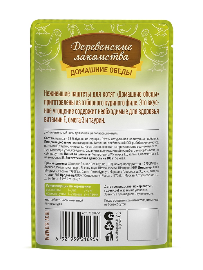 Консервированный влажный корм для котят серии «Деревенские лакомства — Домашние обеды» в виде паштета из мяса цыпленка приготовлен специально для малышей по уникальной рецептуре и имеет нежную текстуру. Это вкусное угощение содержит витамин Е, Омега-3 и таурин.