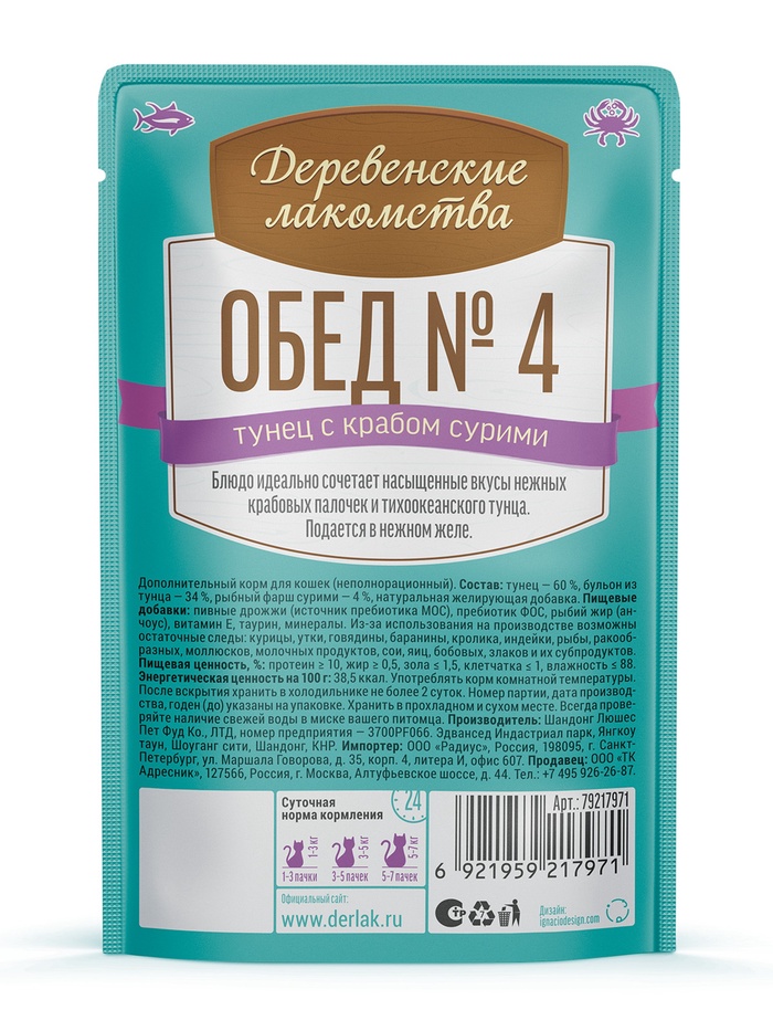 Влажный корм для кошек «Деревенские Лакомства», тунец с крабом сурими, пауч, 50 г