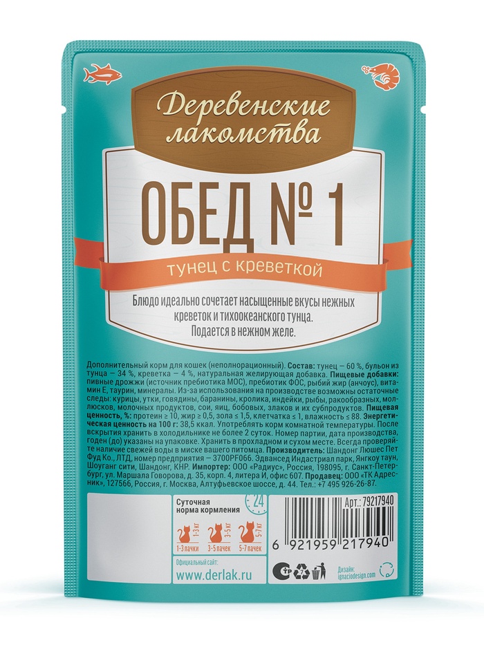 Консервированный влажный корм для кошек серии «Деревенские лакомства — Рыбные обеды» содержит большое количество мяса тихоокеанского тунца, чей вкус идеально сочетается с отборными креветками. Тёмное мясо тунца отличается нежной текстурой и более ярким ароматом, такое мясо насыщает корм вкусом морской рыбы. Подаётся в нежном желе, которое не только улучшает текстуру корма, но и способствует лучшему усвоению питательных веществ.