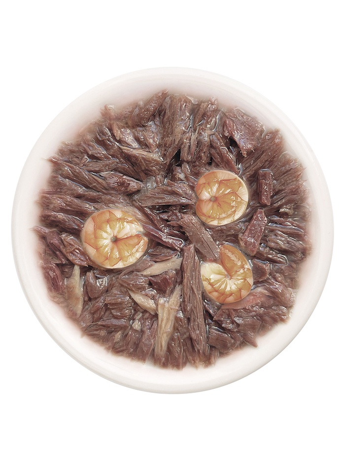 Состав: тунец 60 %, бульон из тунца 34 %, креветка 4 %, натуральная желирующая добавка.