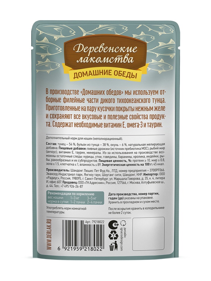 Влажный корм для кошек «Деревенские лакомства" Тунец с окунем в нежном желе, пауч, 70 г